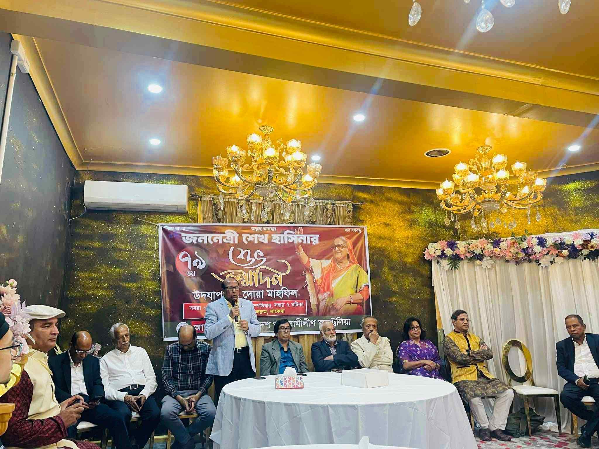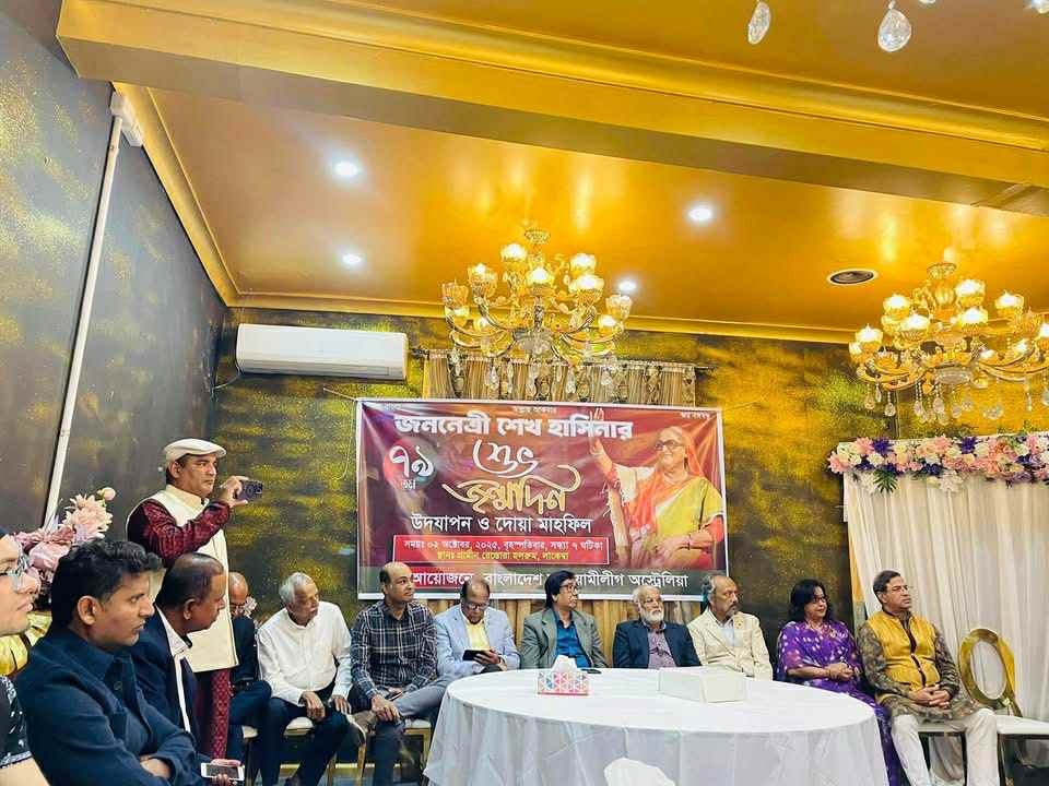 সুমন চৌধুরী, সিডনিঃ ০২ অক্টোবর ২০২৫ সিডনির লাকেম্বার গ্রামীন রেস্তোরার হলরুমে বিশিষ্ট শিক্ষাবিদ, লেখক ও কলামিষ্ট শ্রদ্ধেয় কাইউম পারভেজের সভাপতিত্বে ও মাকসুদুর রহমান সুমন চৌধুরীর সঞ্চালনায় বাংলাদেশ আওয়ামীলীগ অস্ট্রেলিয়া জননেত্রী শেখ হাসিনার ৭৯তম শুভ জন্মদিন উপলক্ষে আলোচনা সভা ও দোয়া মাহফিলের আয়োজন করেন।