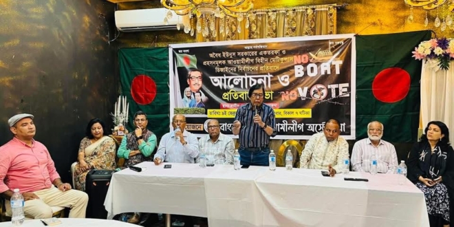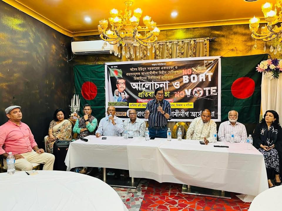 সুমন চৌধুরীঃ সিডনির স্থানীয় গ্রামীণ রেস্তোরার হলরুমে ৯ই ফেব্রুয়ারি ২০২৬ অবৈধ ইউনুস সরকারের একতরফা ও প্রহসনমূলক আওয়ামীলীগ বিহীন মেটিকুলাস ডিজাইনের নির্বাচনের প্রতিবাদে বাংলাদেশ আওয়ামীলীগ অস্ট্রেলিয়া এক আলোচনা ও প্রতিবাদ সভার আয়োজন করেন।